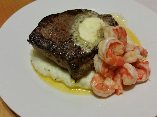 Pan-seared sirloin steak with garlic compound butter on top of Boursin mashed potatoes and garlic-infused butter shrimp