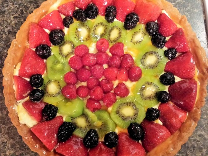 A beautiful fruit tart pinwheel on top of vanilla custard brings sweet and tart to life