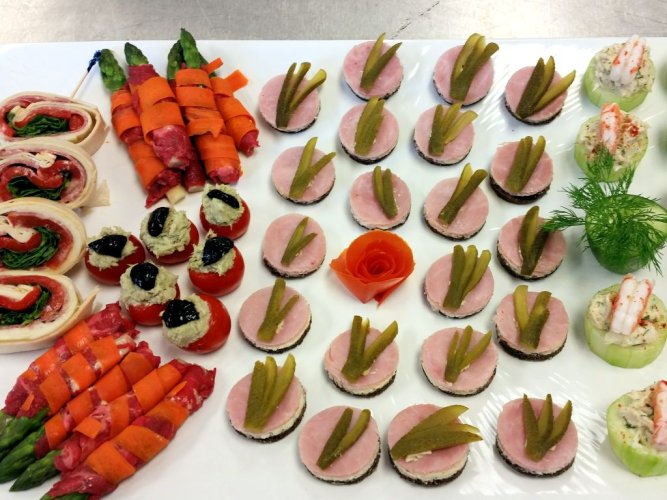Amuse-bouche platter (antipasto pinwheel, beef-wrapped asparagus, stuffed tomatoes, canapes, cucumber cups with crab salad and shrimp garnish