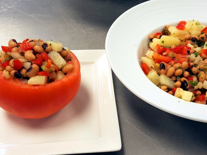 Black-eyed pea salad-stuffed tomato with salad in bowl presentation on the side